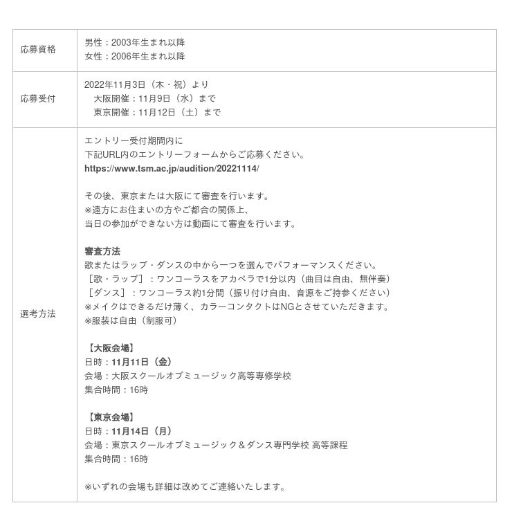 高等課程だけでなく専門課程でもK-POPコースのあるTSM。韓国の芸能事務所との関係性は日本の専門学校でもトップクラスです。その縁もあって今回のオーディションを開催することになりました。