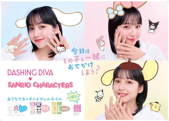 「今日はどの子と一緒におでかけしよう?」というコピーのもと、おでかけ前に6キャラクターから選んで、自宅で簡単に自分のファッションの一部にできるジェルネイルをビジュアル化するために「glaze」はシナモロール、「MAGIC PRESS」はマイメロディ、「GLOSS」はポムポムプリンと、商品に合わせて山之内さんとキャクターが一緒にいる?表現にいたしました。是非、皆さんもお気に入りのキャラクターと一緒におでかけを楽しんでください。