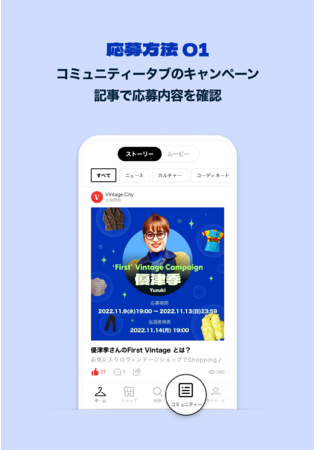 STEP1.ヴィンテージ・ファッション・アプリ「Vintage.City(ヴィンテージ・シティ)」内の「コミュニティ」ページに公開される「キャンペーン記事」で応募内容を確認。