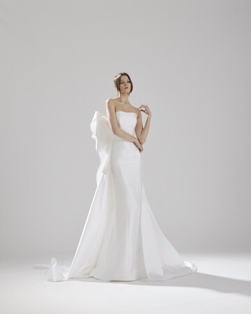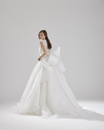 2023年の新作は、純粋さと予想外のボリュームをもった魔法のようなコレクションであり、「無限の愛」と「魂を超えた魅惑的な感情」を作品で伝えた。中でも、デザイナーANTONIOの亡き母 に向けたモデル「Mari」は、環境再生型素材である細い糸の未使用部分を再生する生地である絹の羽毛で製作され、クラシカルさの中にパウダーピンクだからこそ叶う気高い可憐さはANTONIO RIVAならではの1着。