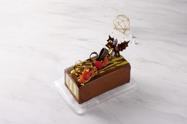 ピスタチオとアールグレイの縦縞の可愛いムースと、チョコレートムース、アプリコットのジュレの酸味をアクセントに思い出に残る素敵なクリスマスを。