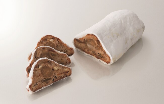 クリスマスの定番品。キルシュワッサーに漬け込んだ4種のフルーツ(アプリコット、いちじく、グリーンレーズン、オレンジ)とマジパンローマッセを使用した薫り高いシュトーレン。