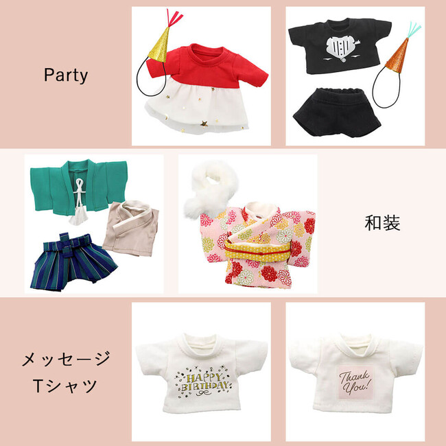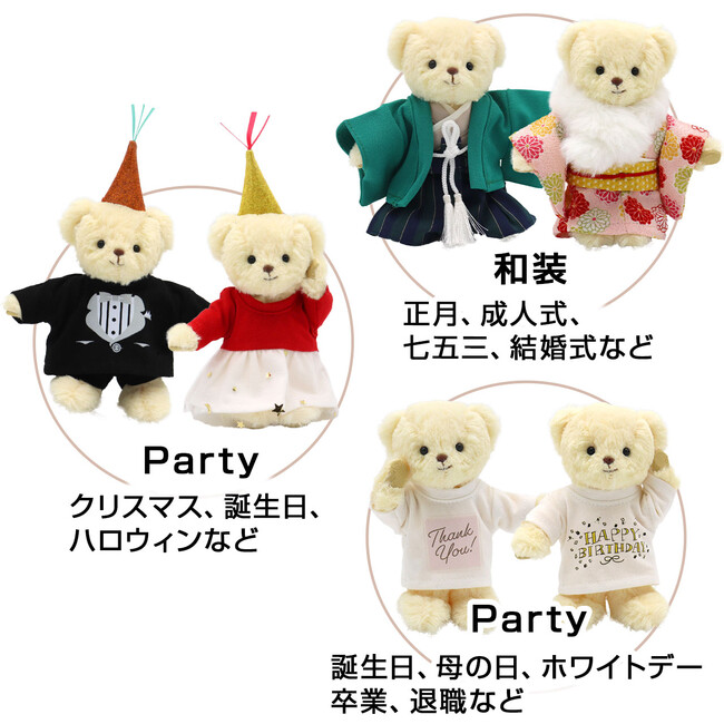 クリスマスや誕生日にパーティ服を着せて、部屋に飾ったり、和服を着てお正月や成人式を演出したり、メッセージプリントTシャツで特別なギフトにしたり、服で様々なシーンを演出!使い方は無限大です。