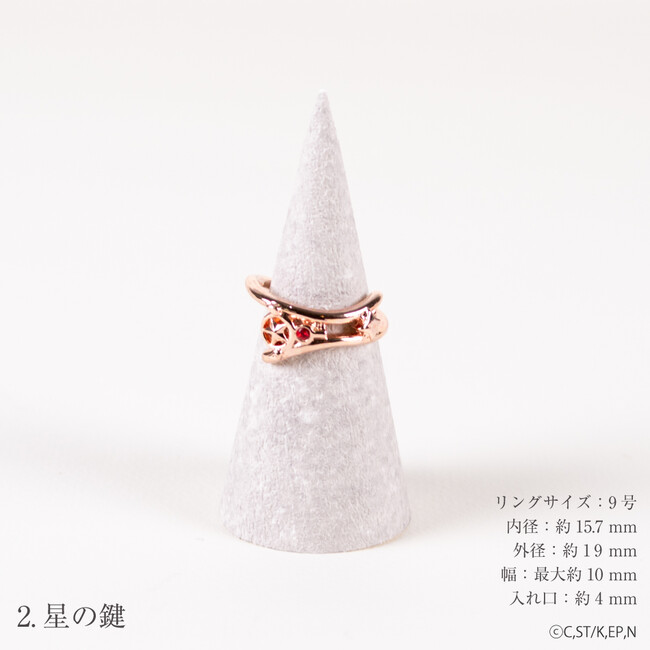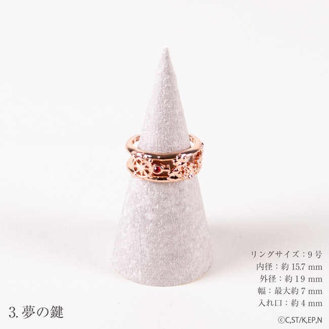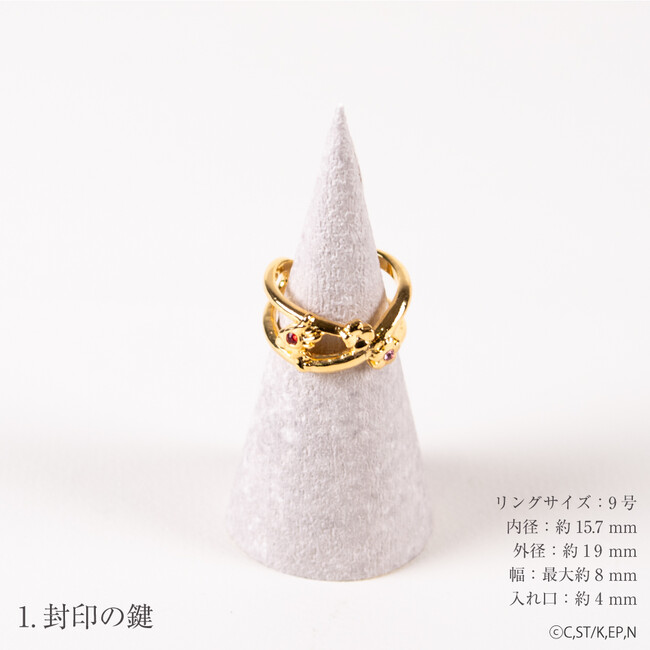 カードキャプターさくら クリアカード編 より 各シリーズの鍵をあしらったリングカフが登場。リングサイズは基本9号となっており、お手元である程度の調整をしていただけます。ケロちゃんのデザインはどの角度から見ても立体的に見えるようになっており、耳、羽、しっぽと要素をふんだんに盛り込んでいます。普段使いにもおススメのカラーバリエーションとデザインになっています。