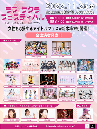 イベント運営・主催を行うリベロック株式会社は、「女性の心と身体を守る」をテーマに発足したプロジェクト、LAB SAKURA PROJECT(ラブサクラプロジェクト)の活動として、アイドルによるライブイベントや、アイドルのジェンダーフリーをテーマとしたトークセッション、DJパフォーマンスを楽しめる「LAB SAKURA FESTIVAL 2022」を開催いたします。