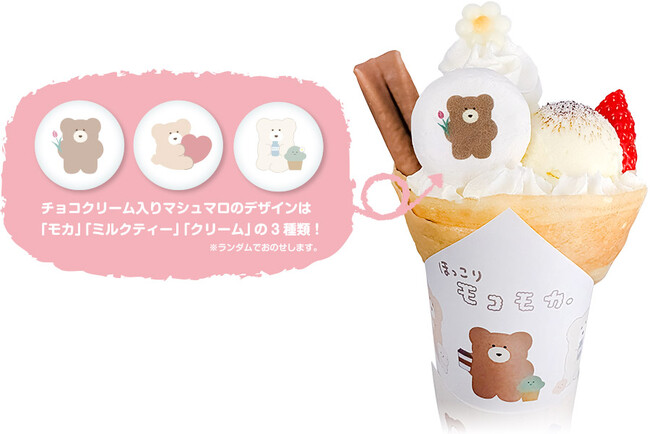 “ホッとした時に、どこからともなく現れるくまのようなふしぎな生き物”ほっこりモコモカたちの「好きなもの」をちりばめたクレープは、小さなお花チョコレートがアクセント!バニラアイスを口に含むと、ふんわりコーヒーが香ります。チョコクリーム入りのプリントマシュマロをトッピングし、オリジナルの巻紙で包んでご提供いたします。かわいらしいモコモカたちのクレープを是非お楽しみください。