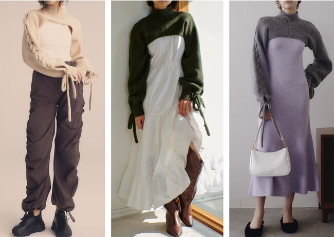 トレンドのシュラッグデザインを取り入れたニットが新登場。