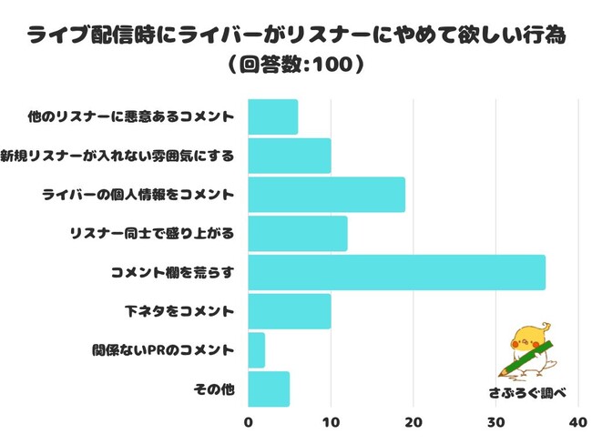 ライブ配信時にライバーがリスナーにやめて欲しい行為をアンケートにて調査したところ、1位は「コメント欄を荒らす」でした。