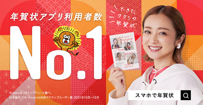 「スマホで年賀状」は、年賀状の作成から印刷、配送まで年賀状づくりのすべてがカンタンにできるスマートフォンアプリです。2012年版から2022年版の11年間で累計600万ダウンロードを達成。スマホひとつでカンタンに作れる点が支持されており、購入者の8割強が女性、中でも特にママ層からの人気が高い年賀状作成アプリの決定版です。