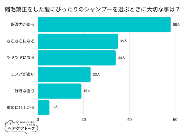 「縮毛矯正をした髪にぴったりのシャンプーを選ぶときに大切な事は?」とアンケート調査した結果、1位は『保湿力がある』でした。