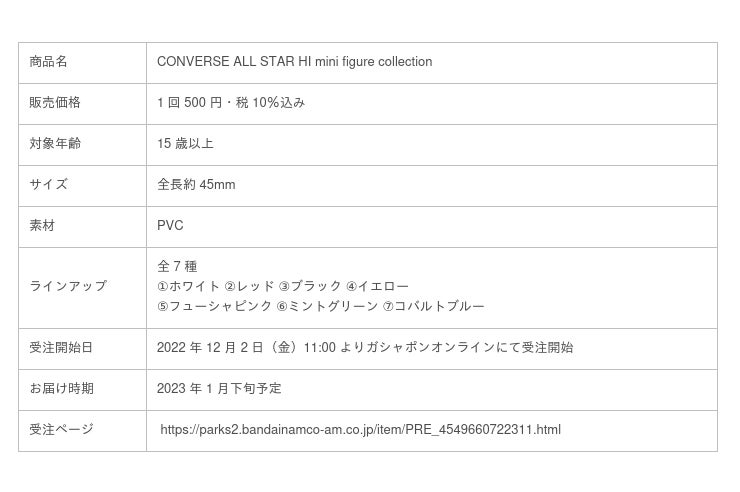 株式会社バンダイ ベンダー事業部(本社:東京都台東区)は、コンバースジャパン株式会社(本社:東京都渋谷区)が製造・販売する大人気シューズ「オールスター HI」をリアルなミニチュアフィギュアにした『CONVERSE ALL STAR HI mini figure collection』(1 回 500 円・税 10%込、全 7 種)を 2022 年 12 月 2 日(金)11:00 より、オンラインでガシャポンが回せる「ガシャポンオンライン」にて受注販売、また 2023 年1月下旬より対象店舗内のカプセル自販機にて販売いたします。