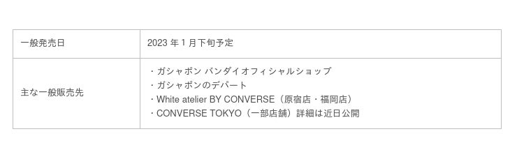 本商品は、2023 年 1 月下旬より一部店舗のカプセル自販機にて一般発売いたします。主な販売先は、カプセ ルトイ専門店の「ガシャポン バンダイオフィシャルショップ」「ガシャポンのデパート」、コンバース直営店の 「White atelier BY CONVERSE」「CONVERSE TOKYO」一部店舗です。最新情報は「ガシャポンオフィシャルサイ ト」もしくはツイッター「【公式】バンダイ ガシャポン」をご確認ください。※在庫がなくなり次第終了です。