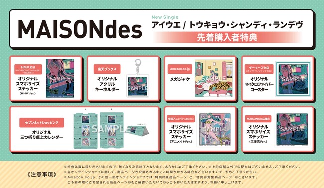 「最もSNSで使われる音楽」を生み出す架空の六畳半アパート音楽プロジェクト「MAISONdes(メゾン・デ)」が12/21(水)にリリースする初のCD商品「アイウエ / トウキョウ・シャンディ・ランデヴ」に封入される特典のカードと、店舗購入者向けの特典絵柄が発表された。