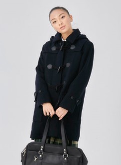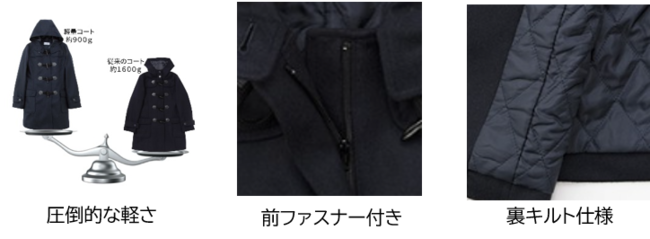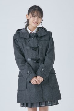 ロングダッフルコートでは最軽量で、表生地は軽量のソフトメルトン、裏地は中綿入りのキルト裏地を採用し、軽さと暖かさの両方を兼ね備えています。ベーシックな紺、黒、チャコールグレーに、明るいライトグレーを加えた4色展開なので、制服に合わせて色を選べます。前合わせにはファスナーを採用しているので、冬の冷たい風の侵入を防ぎます。
