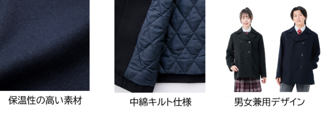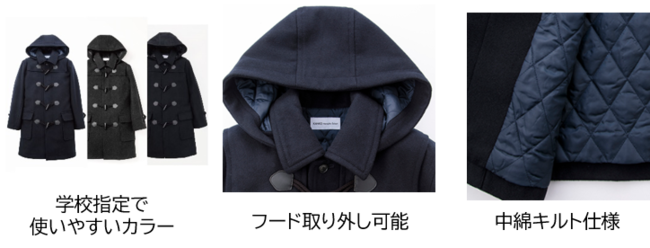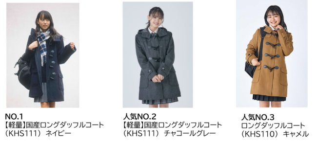 コートデザインランキング上位は、すっきり見える機能性の高い「軽量ダッフルコート」、ゆったり着られる「男女兼用ダッフルコート」、自転車通学でも着用しやすい「ピーコート」が人気。
