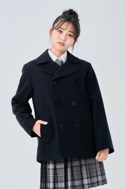 幅広の襟がかっちりした印象で制服との相性が良く、すっきりとしたデザインのピーコートです。表生地は高級感のあるメルトン、裏地は中綿入りのキルト裏地を採用しています。男女兼用型なのでサイズ感は少しゆったりめです。