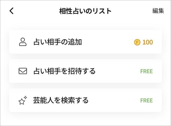 本機能を利用して占い相手を招待した場合、アプリ内にある全ての相性占いにおいて、招待した相手との相性占いを全て無料でお楽しみいただけます。