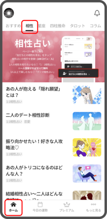 1. アプリ内「ホーム」タブ > 上段「相性」をタップ
