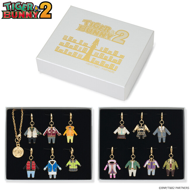 本商品は、アニメ『TIGER & BUNNY 2』に登場するヒーローたちの私服をデザインしたアクセサリーチャームです。ゴールドベースの合金製で、可愛いデフォルメサイズながらも重厚感のあるアクセサリーチャームです。