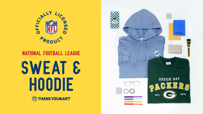 390円(税込429円)を中心としたかわいいアイテムが集まるショップ「サンキューマート」を運営するエルソニック株式会社は、アメリカ最大級のプロアメリカンフットボールリーグ『NFL(National Football League)』とコラボレーションしたアパレルアイテムを全国のサンキューマート店舗と公式オンラインショップで12月中旬より入荷順次販売開始いたします。