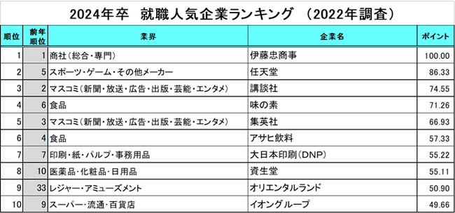株式会社学情(本社:東京都千代田区)は、「就職人気企業ランキング」の結果に関して、コロナ前(2021年卒対象・2019年調査)とコロナ禍(2024年卒対象・2022年調査)を比較。コロナ前(2019年)の調査では、2位のJTBグループを筆頭に、エイチ・アイ・エス(H.I.S)(現・エイチ・アイ・エス(HIS))、オリエンタルランドがトップ10に入っており、「旅行」「レジャー」が上位を占めていました。コロナ禍での調査となった2022年調査では、2位に任天堂がランクインした他、電子コミックが好調な講談社、集英社が10位以内に入り、「デジタルコンテンツを提供する企業」が人気を集めています。2019年調査、2022年調査ともにトップは伊藤忠商事となっています。