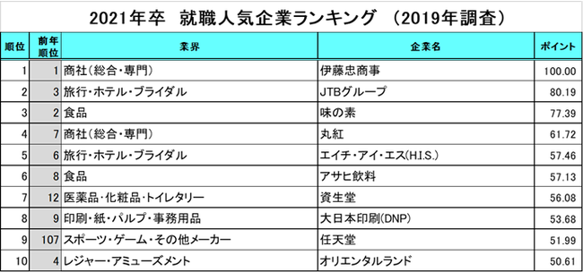 「就職人気企業ランキング」をコロナ前(2019年)と比較しました。