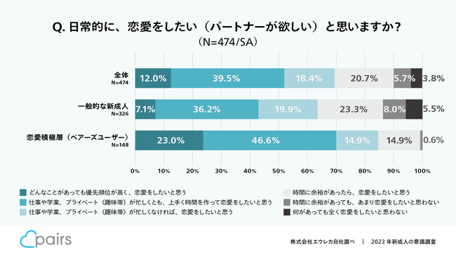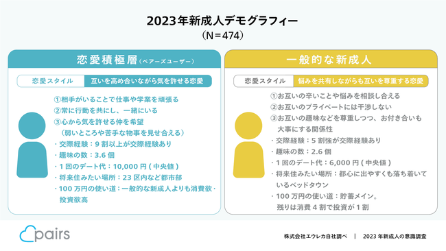 サービス開始10周年を迎えた日本で最も使われている※1恋活・婚活マッチングアプリ「Pairs」(ペアーズ)を運営する株式会社エウレカ(本社:東京都港区、代表取締役CEO 石橋準也)は、2023年に成人を迎える474名(2022年4月~2023年3月に18歳、19歳、20歳になる方)を対象に「2023年新成人の意識調査」を実施し、調査結果を「恋愛」「出会い」「ライフスタイル」の3つのカテゴリーごとに発表します。