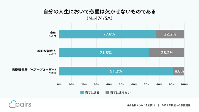 「人生において恋愛は欠かせないものか?」と聞くと、77.8%の人が欠かせないと回答し、人生における恋愛の重要さが見て取れます。恋愛積極層(ペアーズユーザー)については91.2%もの人が欠かせないと回答し、恋愛を重視する傾向はより高まります。