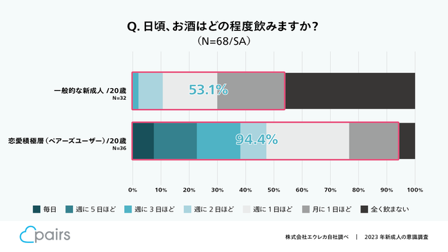 既に20歳を迎えている方に日頃の飲酒頻度について聞くと、恋愛積極層(ペアーズユーザー)の9割以上が「月に1回以上」(94.4%)の頻度で飲酒すると回答した一方で、一般的な新成人の約半数(46.9%)が「飲酒しない」と回答し、恋愛積極層(ペアーズユーザー)と一般的な新成人に大きな差が出ました。