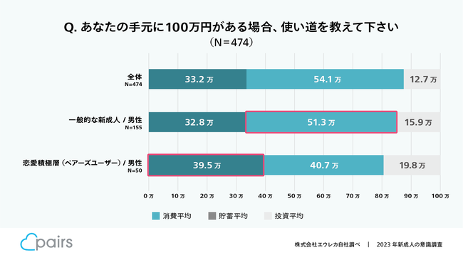 【お金の使い方】100万円あったら54.1万円を貯蓄。恋愛積極層(ペアーズユーザー)は一般的な新成人に比べ、約7万円支出・投資が多い。