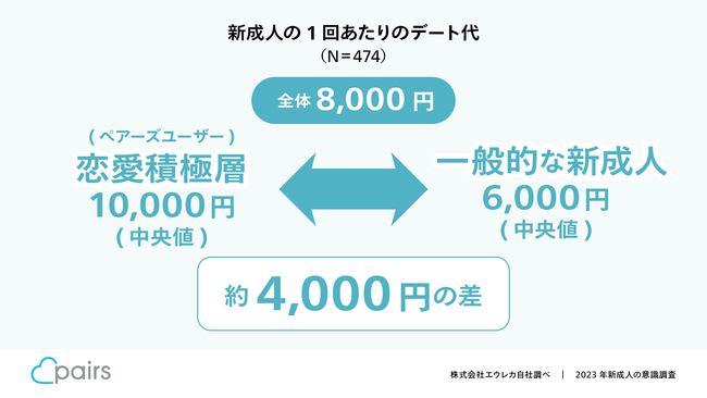 【デート代】恋愛積極層(ペアーズユーザー)は10,000円で、一般的な新成人は6,000円という結果に。恋愛積極層(ペアーズユーザー)は一般的な新成人と比べ4,000円高い結果に