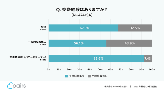 新成人の交際経験を調査すると、67.5%もの新成人が「交際経験あり」と回答しました。恋愛積極層(ペアーズユーザー)では92.6%もの人が「交際経験あり」と回答し、大きな差が出ました。