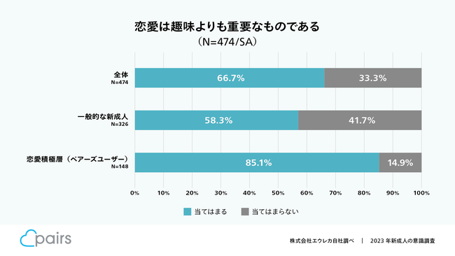 「恋愛は趣味よりも重要なものであるか?」と聞くと、66.7%もの人が当てはまると回答しました。恋愛積極層(ペアーズユーザー)では85.1%が当てはまると答えたのに対し、一般的な新成人は58.3%に留まることから、恋愛積極層(ペアーズユーザー)の恋愛重視傾向はこの結果からもうかがえます。