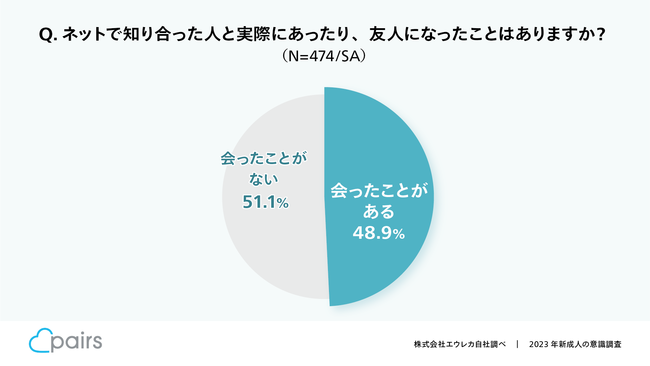 「ネットで知り合った人と実際に会ったり友人になったことはありますか?」という質問では、約半数がインターネット上で知り合った人と会ったり友人になった経験があると回答しました。半数がネットでの出会いの経験があることがわかり、恋愛に限らず、趣味や様々な活動におけるネットでの出会いの一般化がうかがえます。