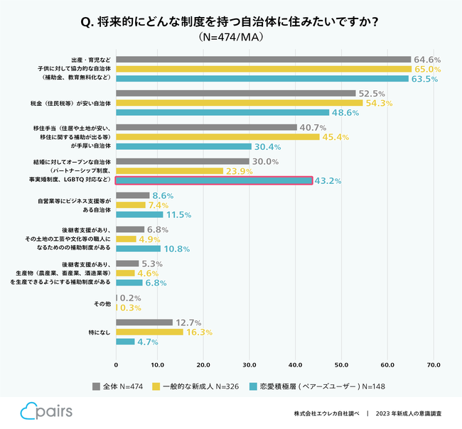住民が住みやすい地域や街を目指して、様々な制度を設けている自治体がある中、「将来どんな制度を持つ自治体に住みたいか」を聞いてみると、「出産・育児など子供に対して協力的な自治体(補助金、教育無料化など)」(64.6%)、「税金(住民税等)が安い自治体」(52.5%)、「移住手当(住居や土地が安い、移住に関する補助が出る等)が手厚い自治体」(40.7%)が上位に入りました。恋愛積極層(ペアーズユーザー)と一般的な新成人の差が顕著に出たのは、「結婚に対してオープンな自治体(パートナーシップ制度、事実婚制度、LGBTQ対応など)」の項目で、約20ポイントの差となりました。
