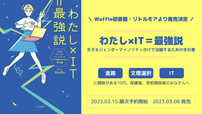 IT分野のジェンダーギャップ解消を目指す特定非営利活動法人Waffle(東京都港区、以下Waffle)は、3月8日(水)の「国際女性デー」に合わせて、プログラミング必修の時代に欠かせない、女子&ジェンダーマイノリティのための新しい進路応援ガイドとして『わたし×IT=最強説 女子&ジェンダーマイノリティがITで活躍するための手引書』をリトルモアより出版いたします。本日2月15日(水)より、リトルモアオンラインショップ、Amazonほかオンライン書店、全国の書店での予約を順次開始いたします。