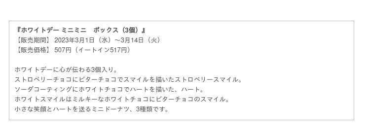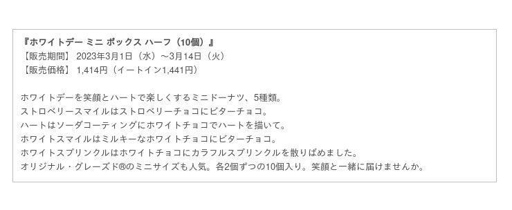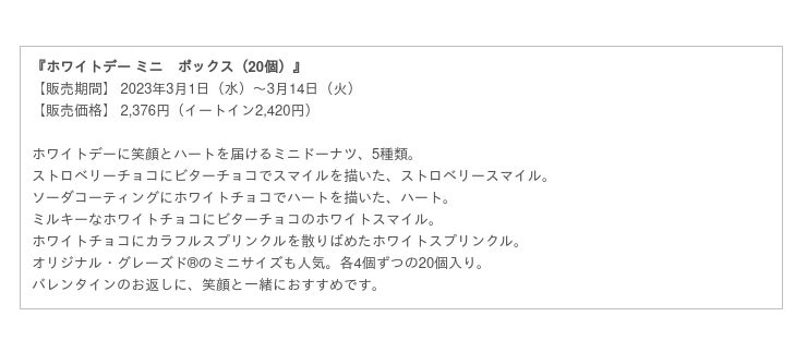 クリスピー・クリーム・ドーナツ・ジャパン株式会社(本社:東京都渋谷区、代表取締役社長:若月 貴子、以下:KKDJ)は、ホワイトデーを盛り上げるプロモーションとして、『ホワイトデー ミニ ボックス』をクリスピー・クリーム・ドーナツ店舗※において2023年3月1日(水)から3月14日(火)までの期間限定で販売します。※催事及びKKD店舗以外の小売店を除く。