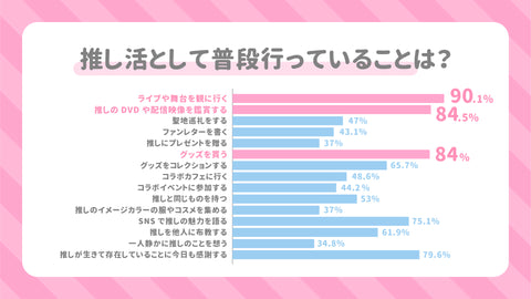 他にも、「SNSで推しの魅力を語る(75%)」「推しを他人に布教する(約62%)」という回答も多く、皆さんの「推し活」のおかげで、推しの魅力がさらに広まっているんだと思いました♪