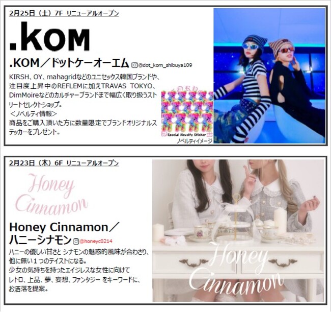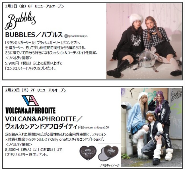株式会社SHIBUYA109エンタテイメント(本社:東京都渋谷区、社長:石川あゆみ)が東京・渋谷で運営する施設「SHIBUYA109渋谷店」では、2023年2月下旬から4月下旬にかけて、新店舗・リニューアル店舗・ポップアップ店舗の計18店舗が、春の改装として順次オープンいたします。