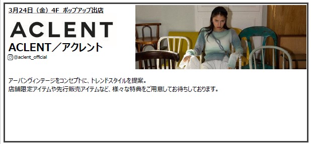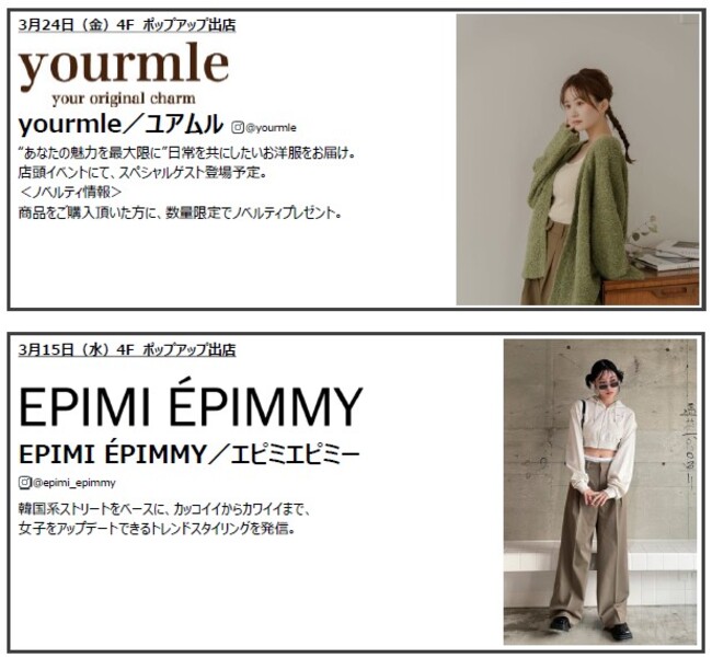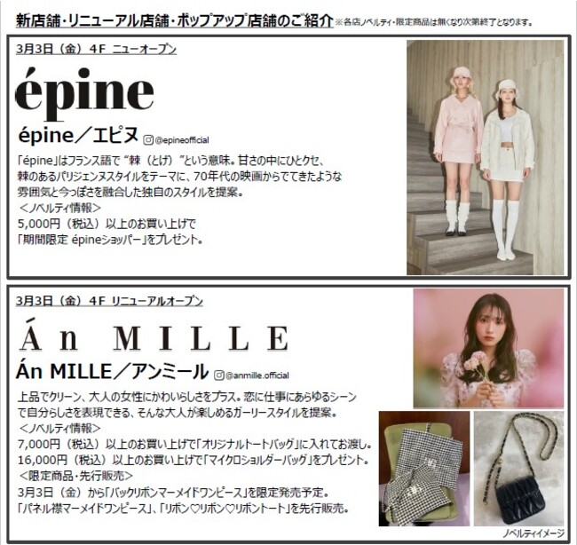 はじまりの季節である春、「なりたい“私”に出会う場所」をコンセプトに、レディスファッションの新店舗「épine」「OLIVE desOLIVE」がオープンするほか、「dazzlin」「Án MILLE」「BUBBLES」を始めとした人気既店、バッグ専門店等がリニューアルオープンいたします。
