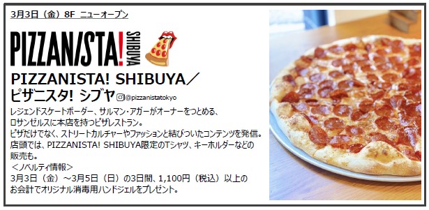 飲食店では、ロサンゼルスのストリートカルチャーに根差したピザレストラン「PIZZANISTA! SHIBUYA」が8Fにオープン。国内商業施設への出店は初となります。