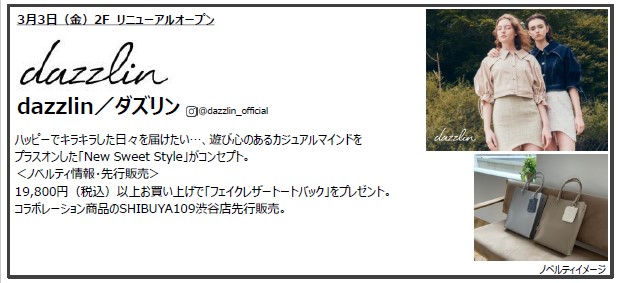 春の改装を記念して、3 月 4 日(土)、 3 月 5 日(日)の 2 日間、 SHIBUYA109 渋谷店 店頭イベントスペースにて、館内でお買い物をしていただいた方を対象に、本キャンペーンのビジュアルを使用したリーフレットを封入したノベルティグッズ、または 3月 3 日(金)に 8F にオープンする「 PIZZANISTA! SHIBUYA 」のスライスピザ 1 カットをお渡しするリニューアルキャンペーンイベントを実施いたします。ぜひお立ち寄りください。