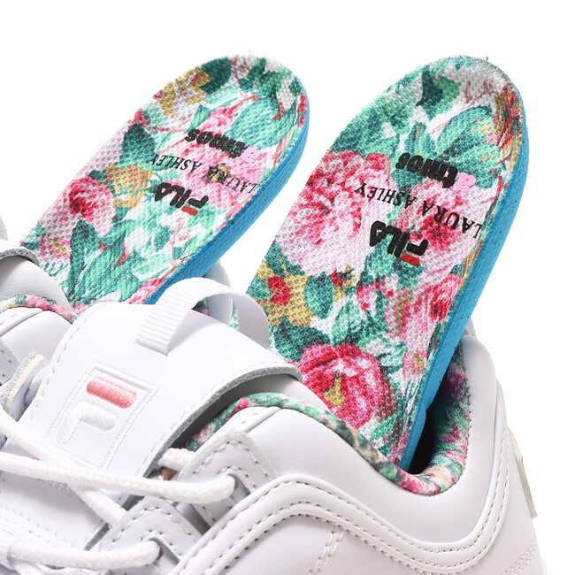 2023年春夏を華やかに飾る”FILA×Laura Ashley×atmos pink”のトリプルコラボレーション。異色ともとらえられるこのコラボレーションにより、ちょっぴり大人の世界に一歩足を踏み入れながら快適な履き心地を追求したシューズが3種類完成しました。ベースモデルは厚底かつ軽量なプラットフォームデザインで確かなクッショニングを確保したFILAスニーカーの代名詞ともいえる定番モデルの” Disruptor 2”から2種類、イタリアにあるFILAミュージアムから発掘されたモデルを復刻させ定番ビンテージレトロなアッパーをフィーチャーした人気のスタイリッシュな