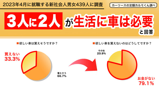 そのような中、車を必要としている新社会人の方はどのような状況に置かれているのでしょうか。定額カルモくんでは、新社会人の男女439人に車に対する意識調査を行いましたので、ご紹介します。