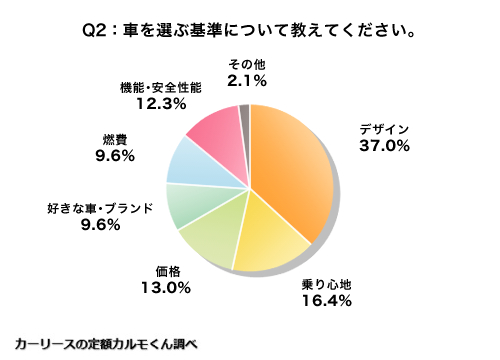 続いて、車を選ぶ基準について聞いたところ、最も多かったのは「デザイン」で37.0%でした。次に多かったのは「乗り心地」で、16.4%という結果になりました。