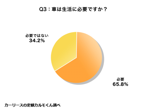 続いて、車は生活に必要かどうか聞いたところ、「必要」と回答した方が65.8%、「必要ではない」と回答した方は34.2%という結果となりました。18~26歳の新社会人のうち、約3人に2人は車を必要としていることがわかりました。