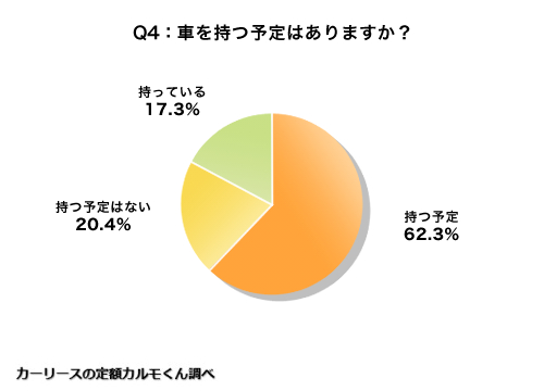 Q3で車は生活に必要と回答した方に、車を持つ予定があるかどうかを聞いたところ、最も多かったのは「持つ予定」で62.3%でした。続いて「持つ予定はない」が20.4%、「持っている」が17.3%という結果になりました。約8割の方が車を持つ予定、または持っていると回答したのに対し、車を必要としながらも持つ予定のない方が2割ほどいることがわかりました。