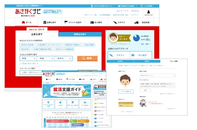 会員数40万名、学生満足度No.1のスカウト型就職サイト(※2022年 オリコン顧客満足度(R)調査 逆求人型就活サービス 就活支援コンテンツ 第1位)。ダイレクトリクルーティングサイト会員数3年連続No.1(※2020年~2022年 東京商工リサーチ調査 ダイレクトリクルーティングサイト会員数 第1位)も獲得しており、最も多くの学生を対象にスカウト配信が可能です。「あさがくナビ」は動画型ダイレクトリクルーティングサイトとして、動画を通して、リアル(企業の雰囲気や社員の声)を体感できるコンテンツを拡充させています。また、「スカウト」と「職種別掲載」で企業にマッチする優秀人材の採用を支援。テレワークの普及・定着で注目が高まる“ジョブ型採用”を可能にする、職種別掲載機能を実装するなど、マッチング精度のさらなる向上に取り組んでいます。朝日新聞のその日の記事から社会や業界に関してのトピックスを就活目線でわかりやすく解説した「今日の朝刊」など、就活ノウハウだけでなく、社会や世の中を知るためのコンテンツを提供しています。