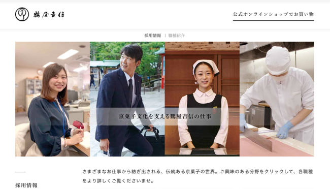 和菓子製造販売の株式会社 鶴屋吉信(つるやよしのぶ)(本社:京都市上京区、代表取締役社長:稲田慎一郎)は、当社公式サイト「京菓匠 鶴屋吉信 公式オンラインサイト」内の採用情報ページを2023年3月1日(水)よりリニューアルいたしました。また、同時に、2024年卒業予定者の新卒採用受付を開始いたしましたことをお知らせいたします。