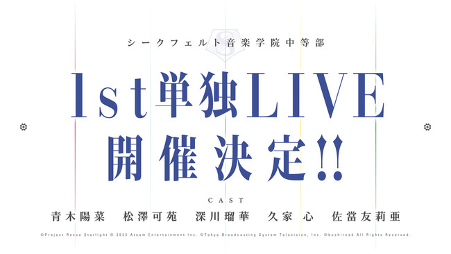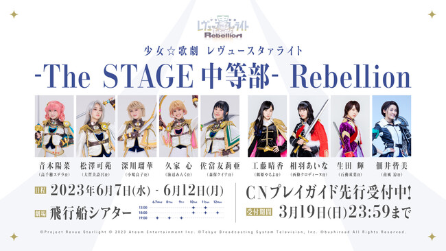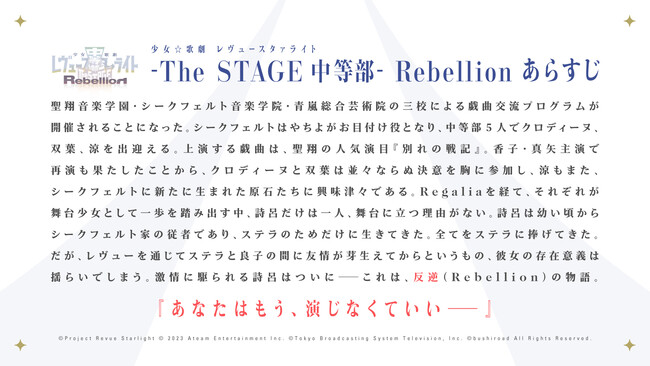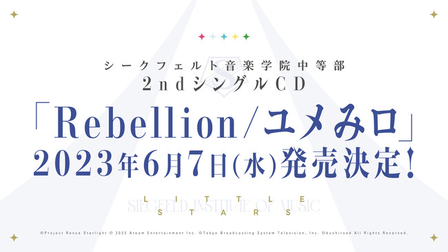 2023年6月に開催する舞台「少女☆歌劇 レヴュースタァライト -The STAGE 中等部- Rebellion」の新情報に加え、2ndシングルの発売や、1st単独LIVEの開催も発表され、今後の展開がますます楽しみとなった。